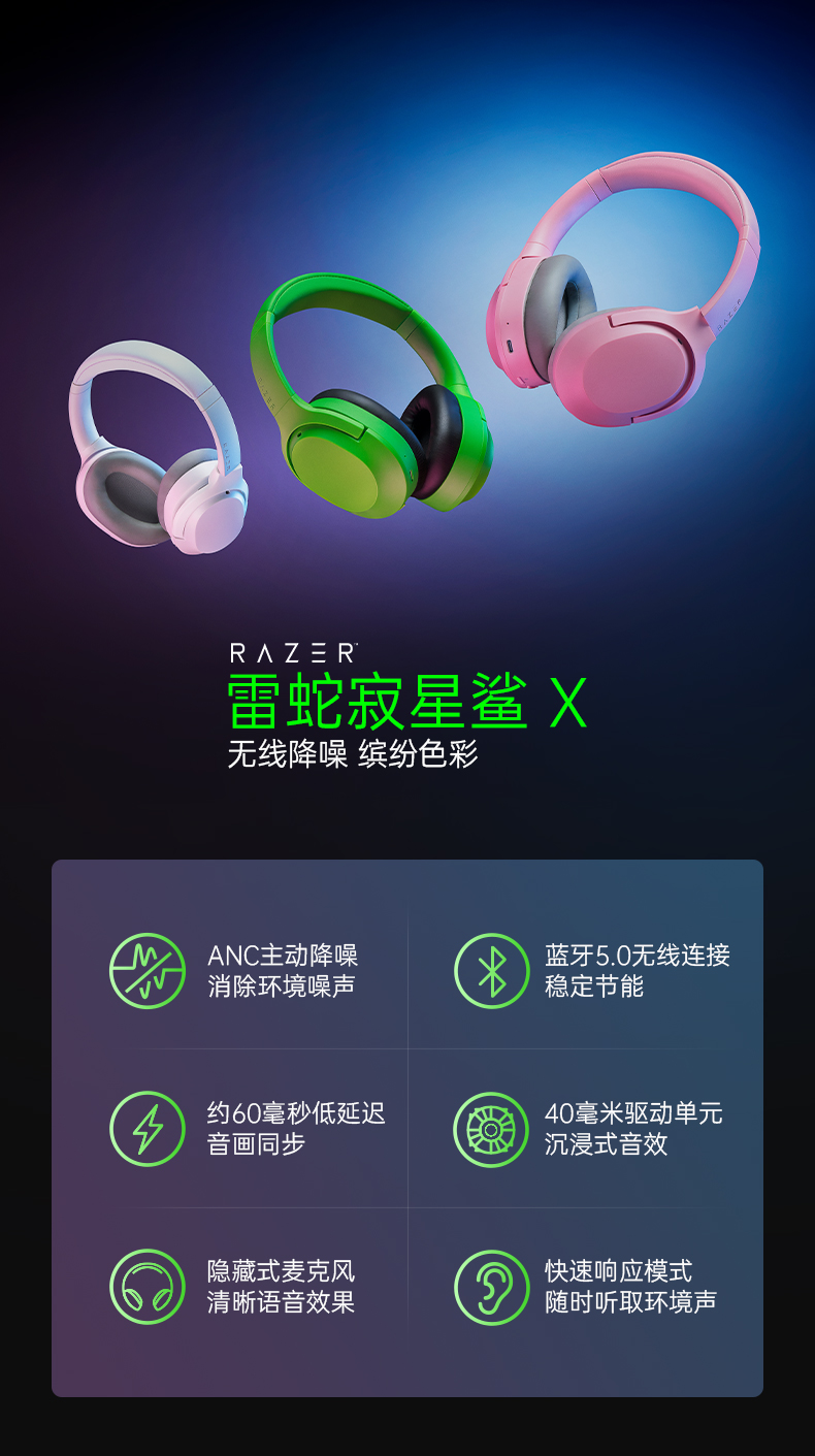 商品名称:雷蛇 Razer 寂星鲨X 主动降噪ANC 蓝牙5.0头戴式 耳机 音乐电竞 游戏耳麦 粉晶