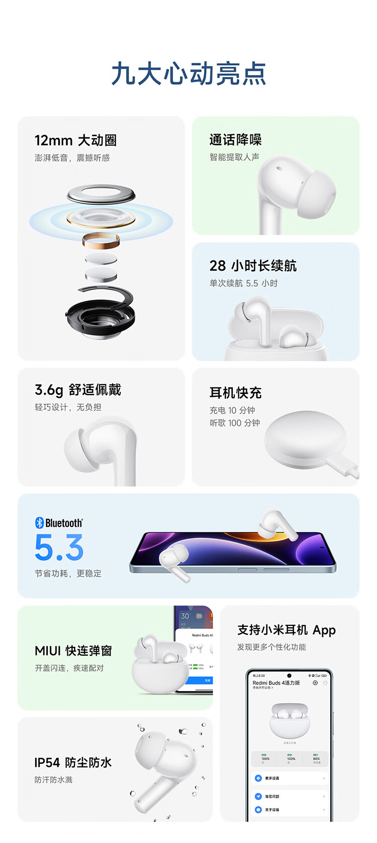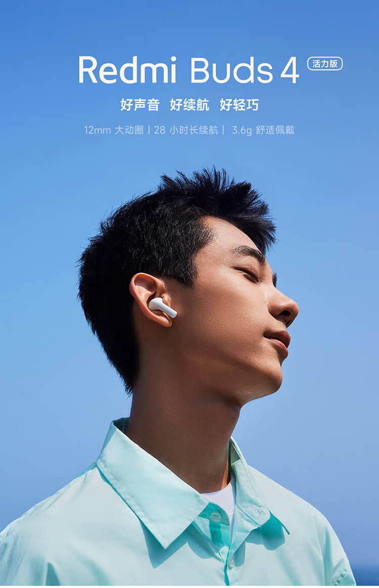 商品名称:小米(MI)Redmi Buds 4 活力版 白色 无线蓝牙耳机 28小时长续航 通话降噪 适用小米华为苹果手机