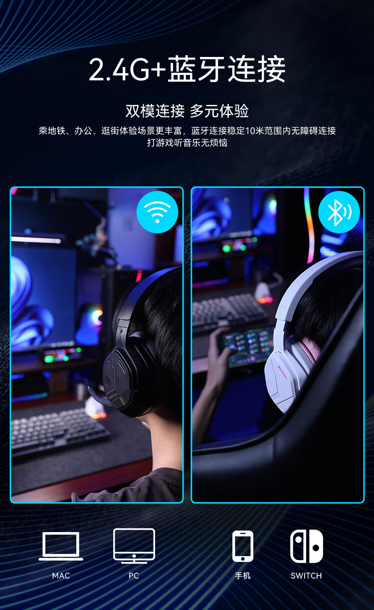 达尔优EH755 头戴式2.4G无线蓝牙耳机双模麦克风降噪虚拟7.1声道男女网课听歌网课学习游戏直播 黑灰